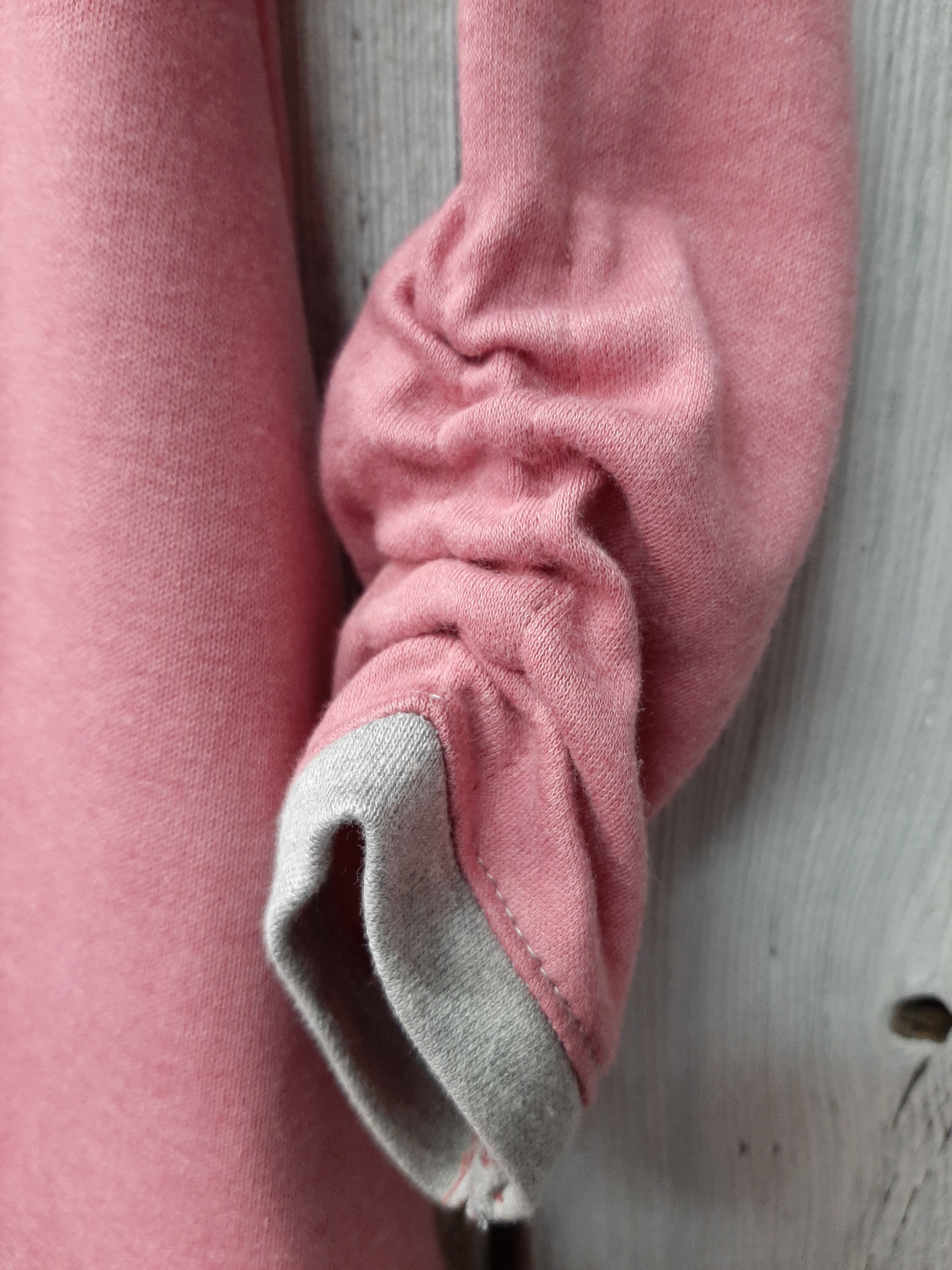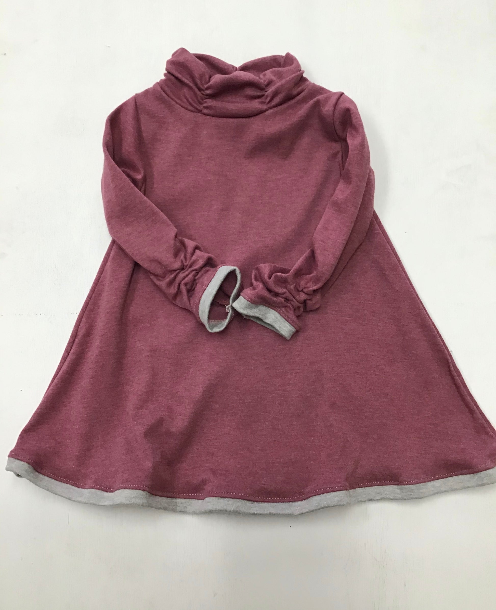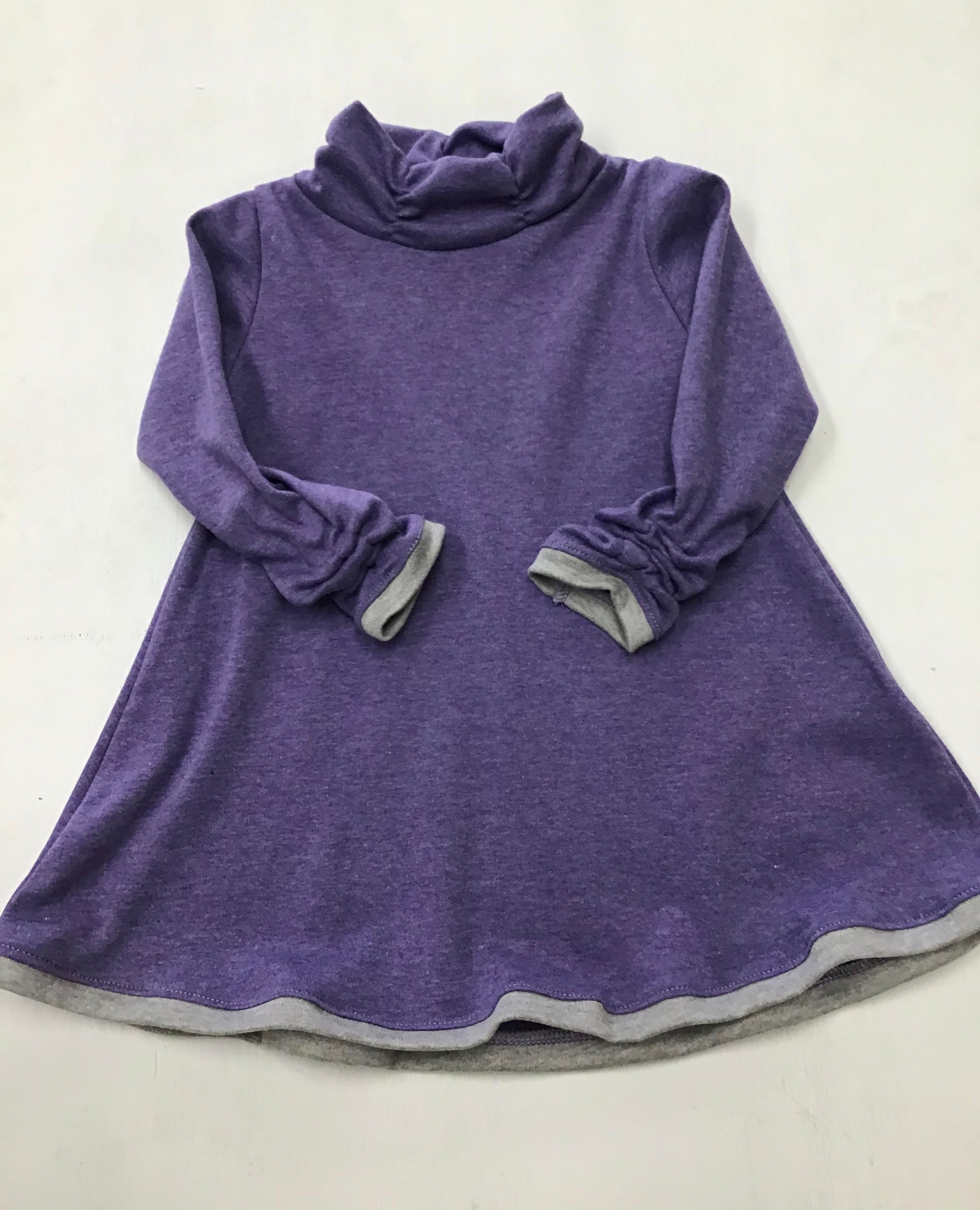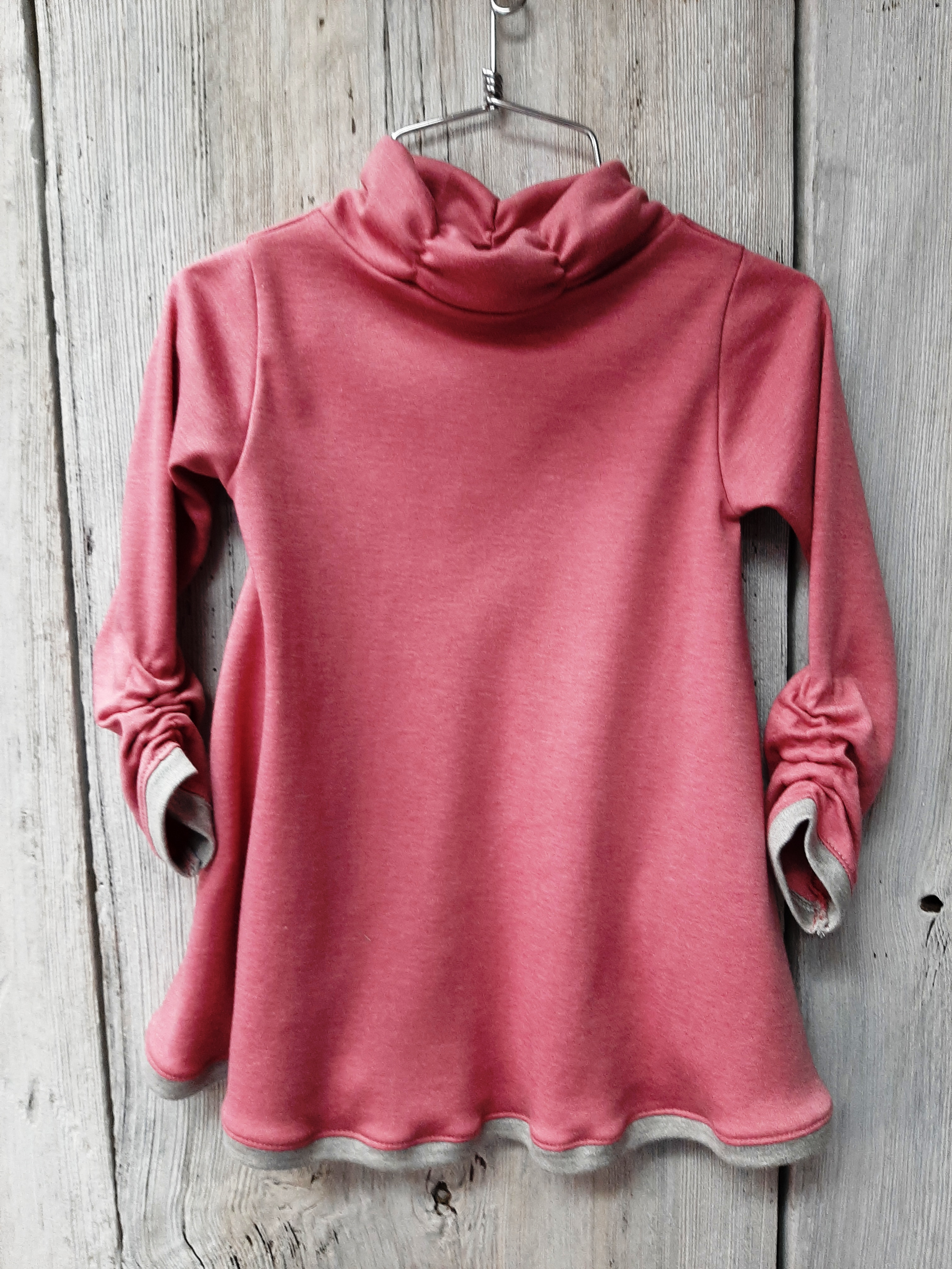 This stylish comfortable garment begins as a dress and then turns into a top. Its adjustable ribbon sleeve allows for extra growth in the sleeve. It is handmade in our store with quality Canadian milled knit. It's blended contents make for an easy care washer dryer garment. Great for special occasions or for everyday wear.