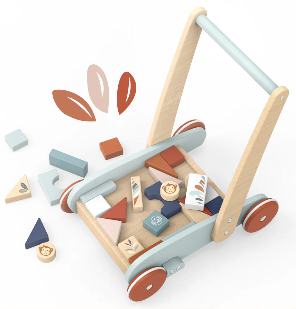 The 27 colorful blocks included serve as weight for the wagon when baby pushes it but also add fun to stacking and building.