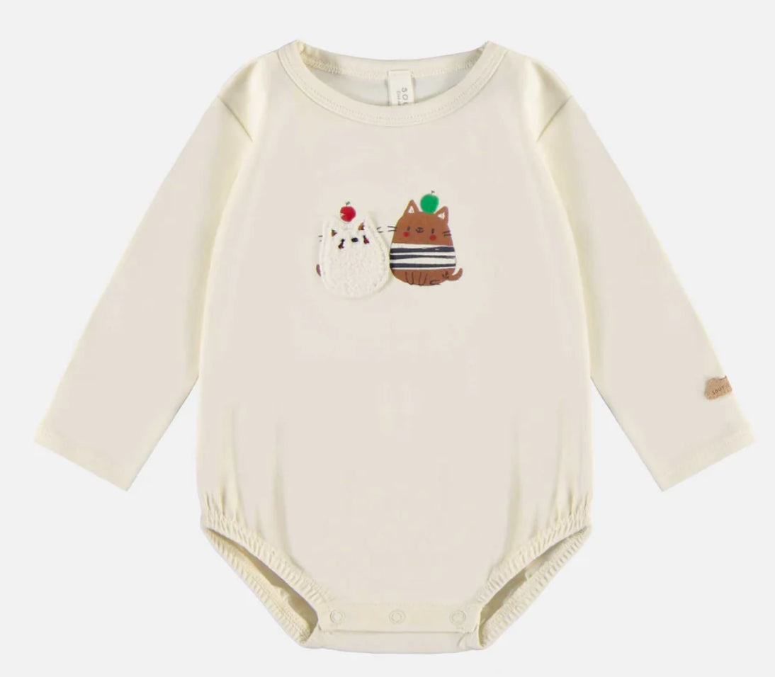 Beige Long-Sleeved Bodysuit In Cotton with Cats and ApplesSouris Mini