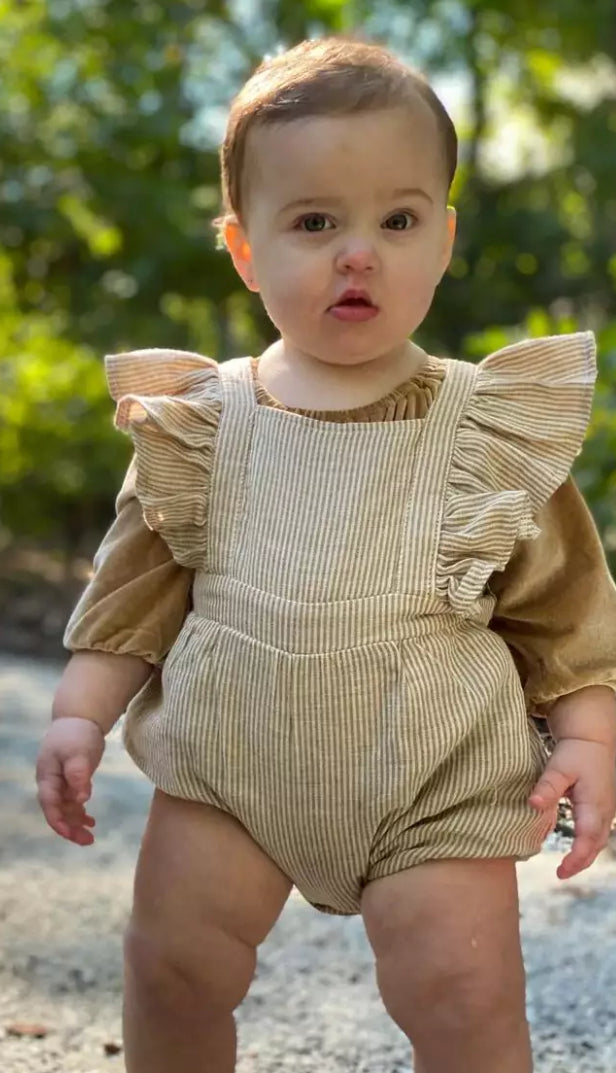 This little romper is the perfect layering piece for the Fall & holiday season! In an array of gorgeous colors with the sweetest little ruffle sleeve and cris-cross back.