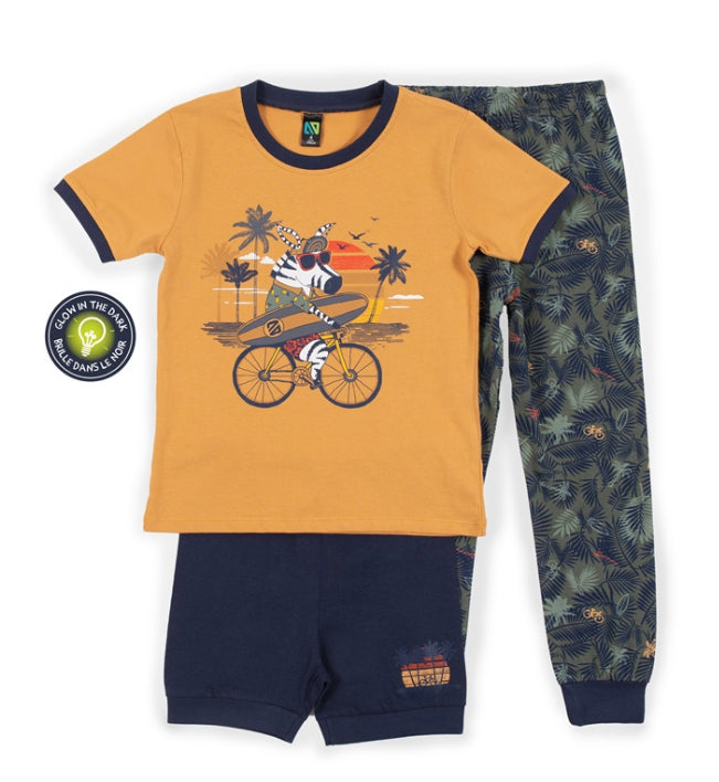 Glow in the dark three-piece jersey pajama set that includes: • Long sleeve T-shirt with a print • Printed pants -