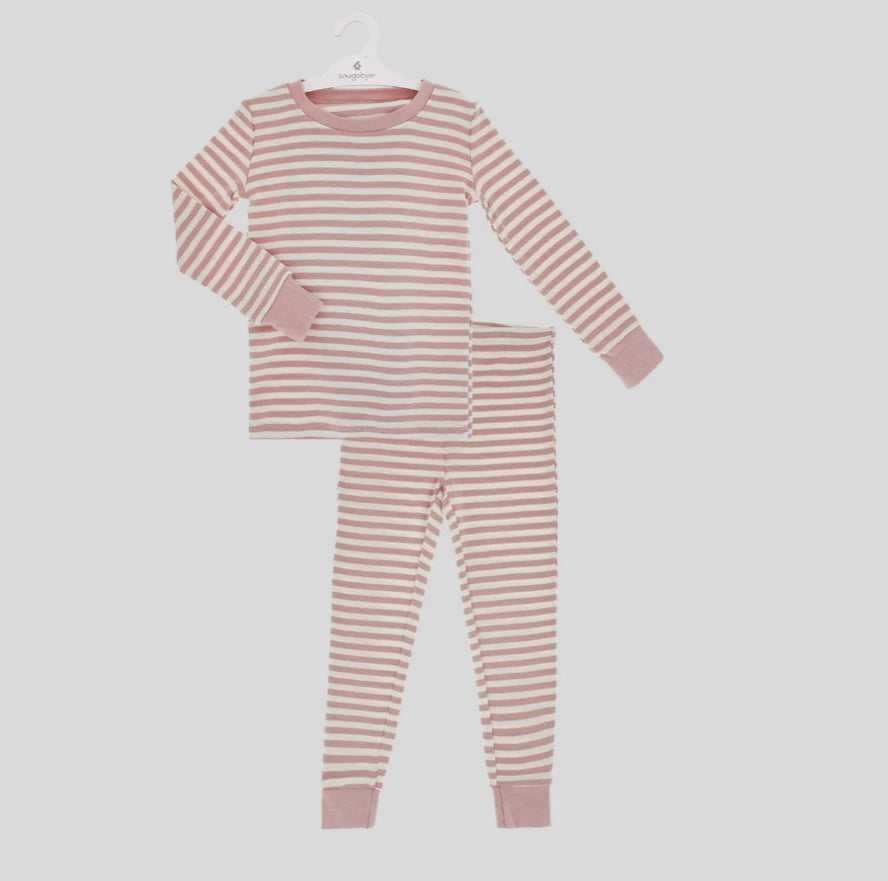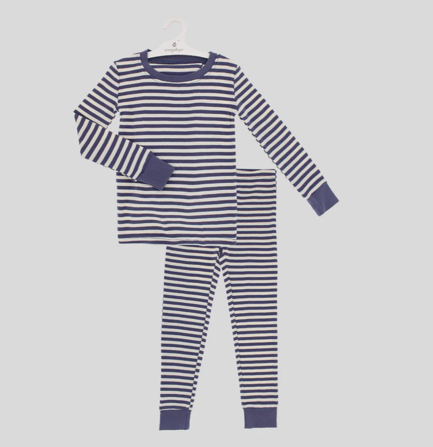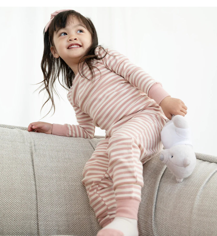 This organic toddler pajama set is a needed addition to your little one's sleepwear. Designed with cuffed hems and sleeves, the set is super soft and stretchy. Our organic cotton are natural fibres grown without the use of synthetic pesticides, insecticides, herbicides, or GMOs (Genetically Modified Organisms) and treated sustainably to create the softest, stretchiest fabrics. It comes in stripes with neutral warm pastel grey colour, Folkstone grey, that will incorporate perfectly into the rest of your baby's wardrobe and sleepwear.