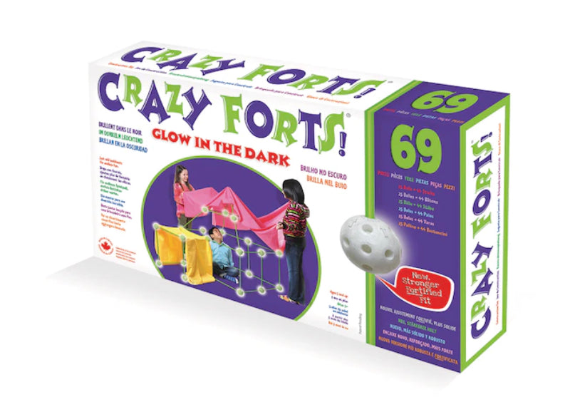 Just add bed sheets for endless fun! Children of all ages love building fun structures where they can play endlessly in their imaginary worlds. Crazy Forts are powered by a child's imagination. A single Crazy Forts Kit contains 25 geometrically precise balls and 44 sticks that connect to create a multitude of possible play structures. Simply throw a bed sheet over top and watch their creativity flourish. A rocket today an undiscovered cave tomorrow a princess' castle one day and a wild horse in a corral next week are all possible with Crazy Forts. The more they have, the better it gets as multiple kit structures are even more impressive. Durable, portable and best of all, no batteries are required! Crazy Forts makes imaginary play easy and fun! Great buy for kids with imaginations! No more need for couch cushions. This product with entertain your child for hrs. Available in standard, pink, and glow in the dark!