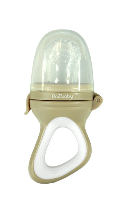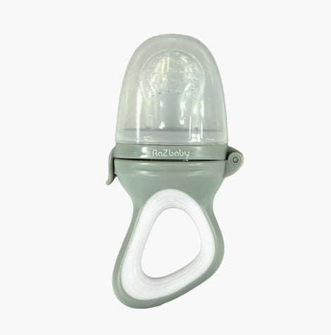 RaZbaby Baby Fruit Feeder are engineered to allow only the tiniest of food pieces to go through to prevent choking. It is a safe way to start introducing baby to solid food as your child goes through the teething phase. Try frozen Raspberries, Bananas, Strawberries, Oranges, Pineapples, Grapes, etc and even frozen breast milk in your baby feeder.It is also designed with textured surfaces and soft chewable silicone that ease teething discomfort by chewing. Use the RaZbaby Silicone feeder to safely introduce solids or fill with frozen foods to soothe teething pains.Simply place food/fruit into nipple and close. Dishwasher Safe BPA Free Latex Free, Phthalates Free, Lead Free with 100% Food Grade Silicone. The quick snap ring allows for easy assembly and cleaning of the feeder.