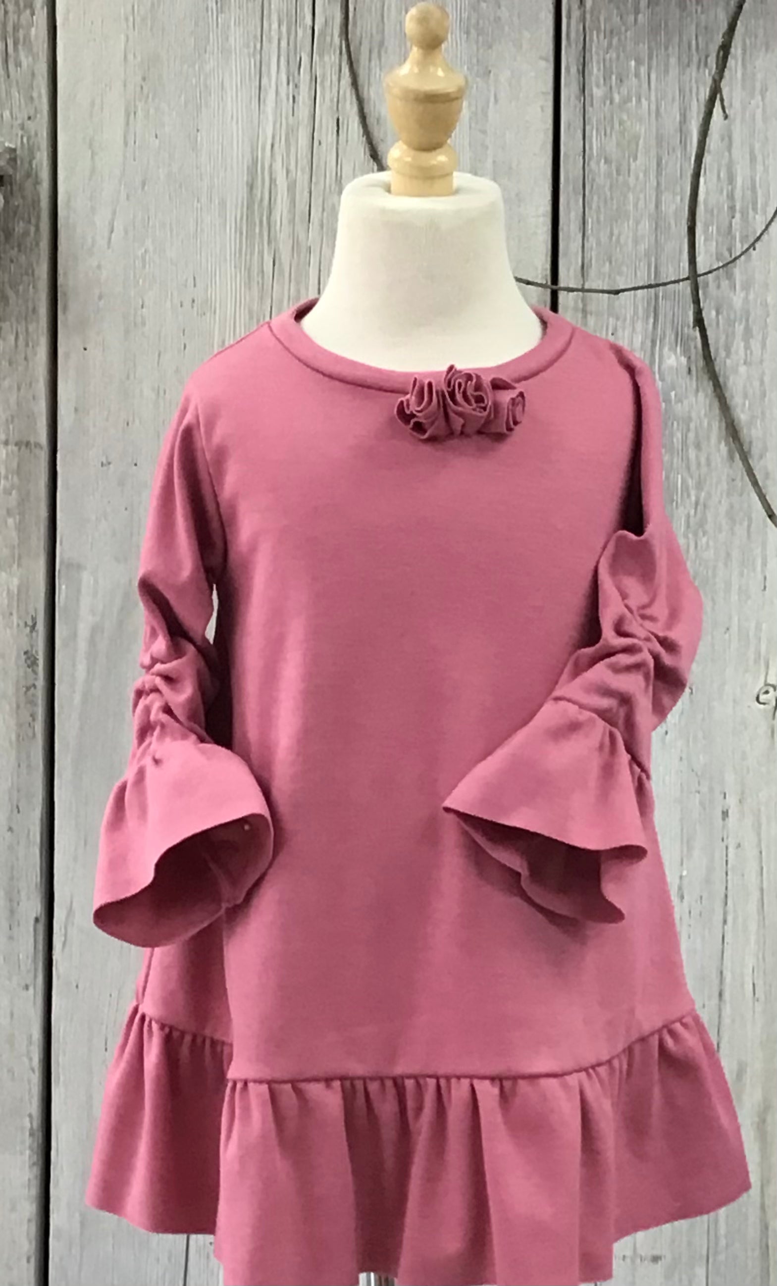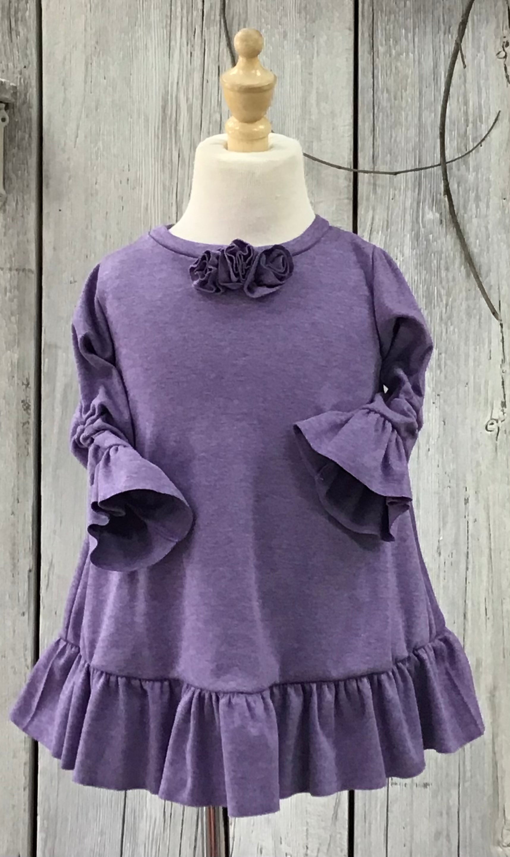 This 3/4 length sleeve dress is a great mid season outfit for your little one. The adjustable sleeve allows you to wear it as a tunic top after iit is too short to wear as a dress. We make this garment in the store on Hastings St in Bancroft. It is made with a quality blend knit fabric.