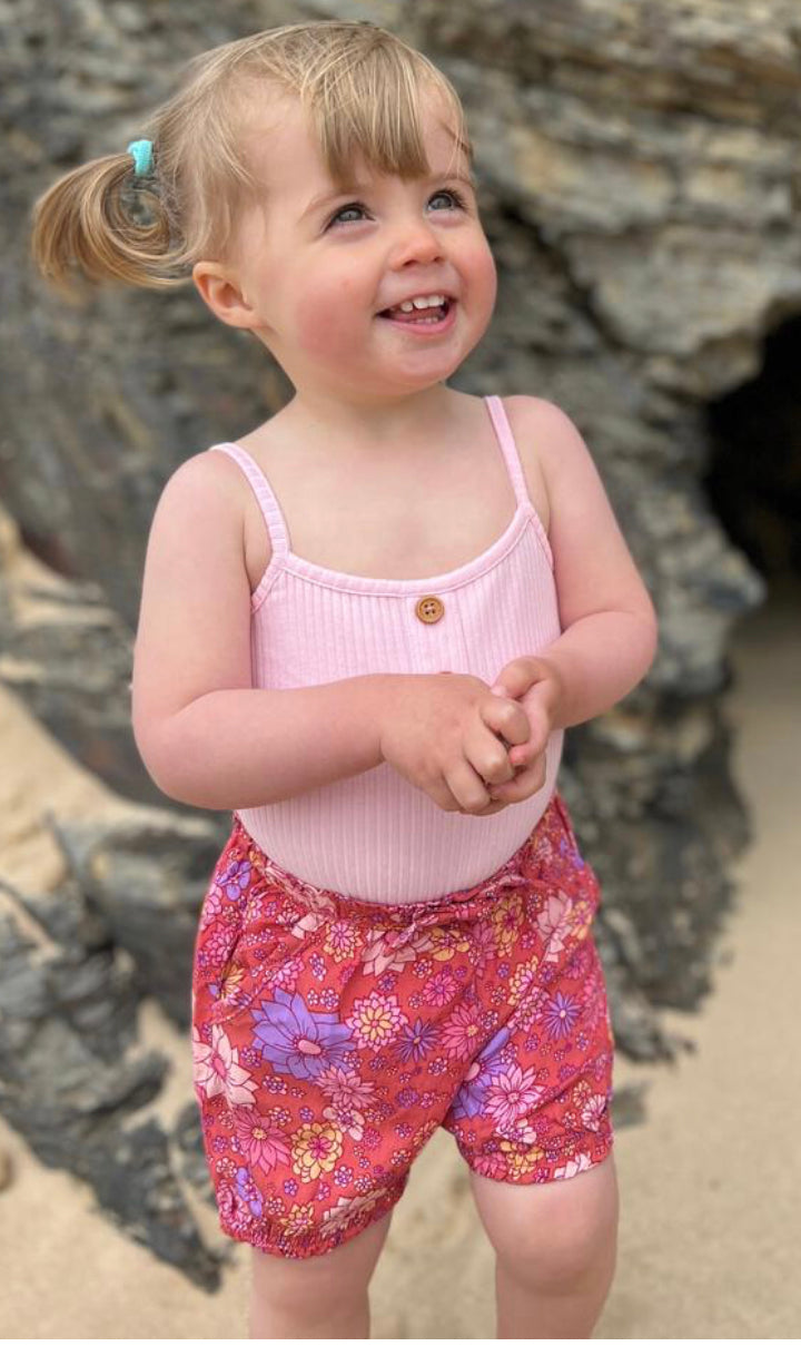 Our Lucy Shorts are back for another season and positively blooming thanks to the funky retro floral and darling bow detail at the waist. They pair perfectly with one of our onesies... and did we mention it matches older sister looks!