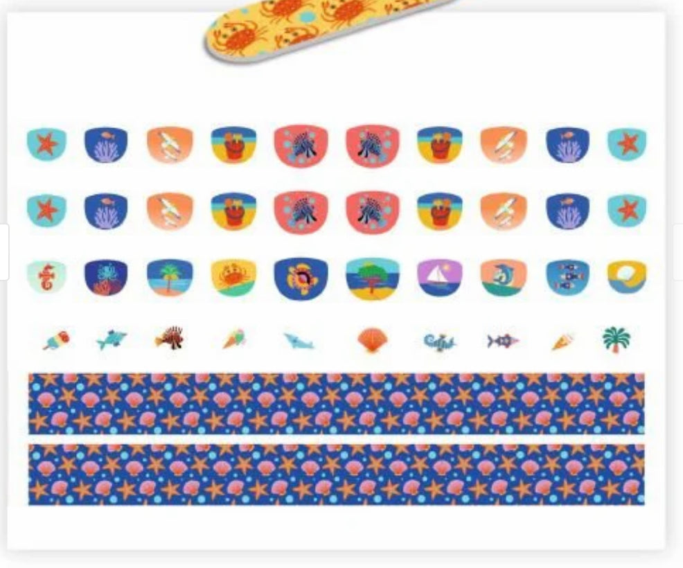 Finally, a super/quick manicure for little ones that’s easy to put on and take off! From the smallest sticker for your little finger to the largest for your thumb: stick, press, done! No nail polish to get chipped – just the joy of decorating your nails with pretty illustrations! And to change up the patterns or create your own sticker, cut a piece of the adhesive strip to the size of the width of your nail.