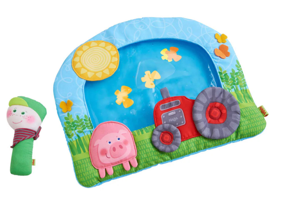 Ready for an E-I-E-I-O kind of tummy time? With our HABA USA farm-themed tummy time mat, your child will have a blast playing with a pig’s squeaker, a crinkly-foil sun, and a farmer who doubles as a rattle toy. And to make tummy time even more fun, your child can pat the mat’s water bladder to cause floating butterflies to move. This exciting activity mat will keep your child crawling back for more again and again.
