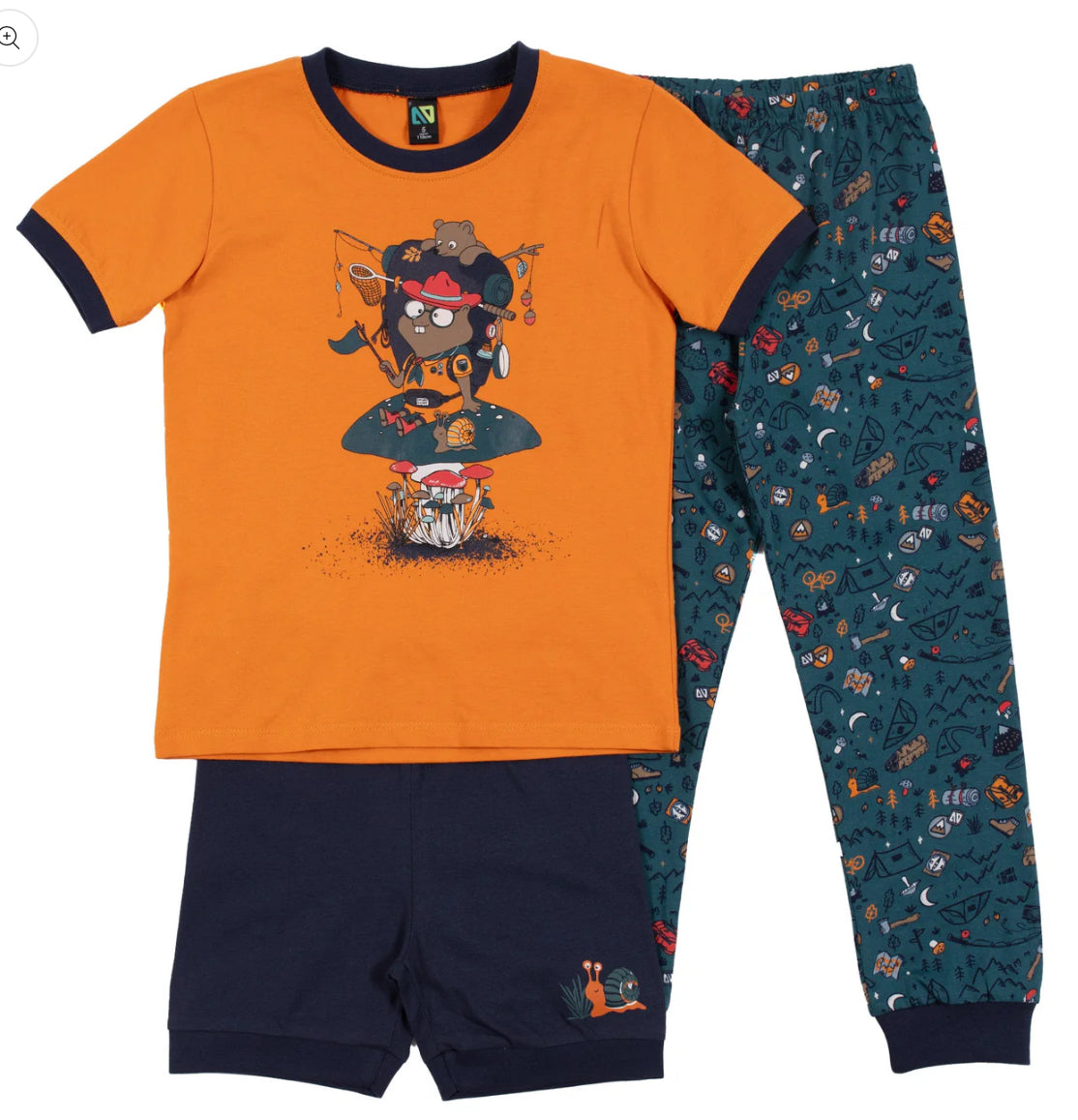 Glow in the dark two-piece jersey pajama set that includes: • Long sleeve T-shirt with a print • Printed pants -