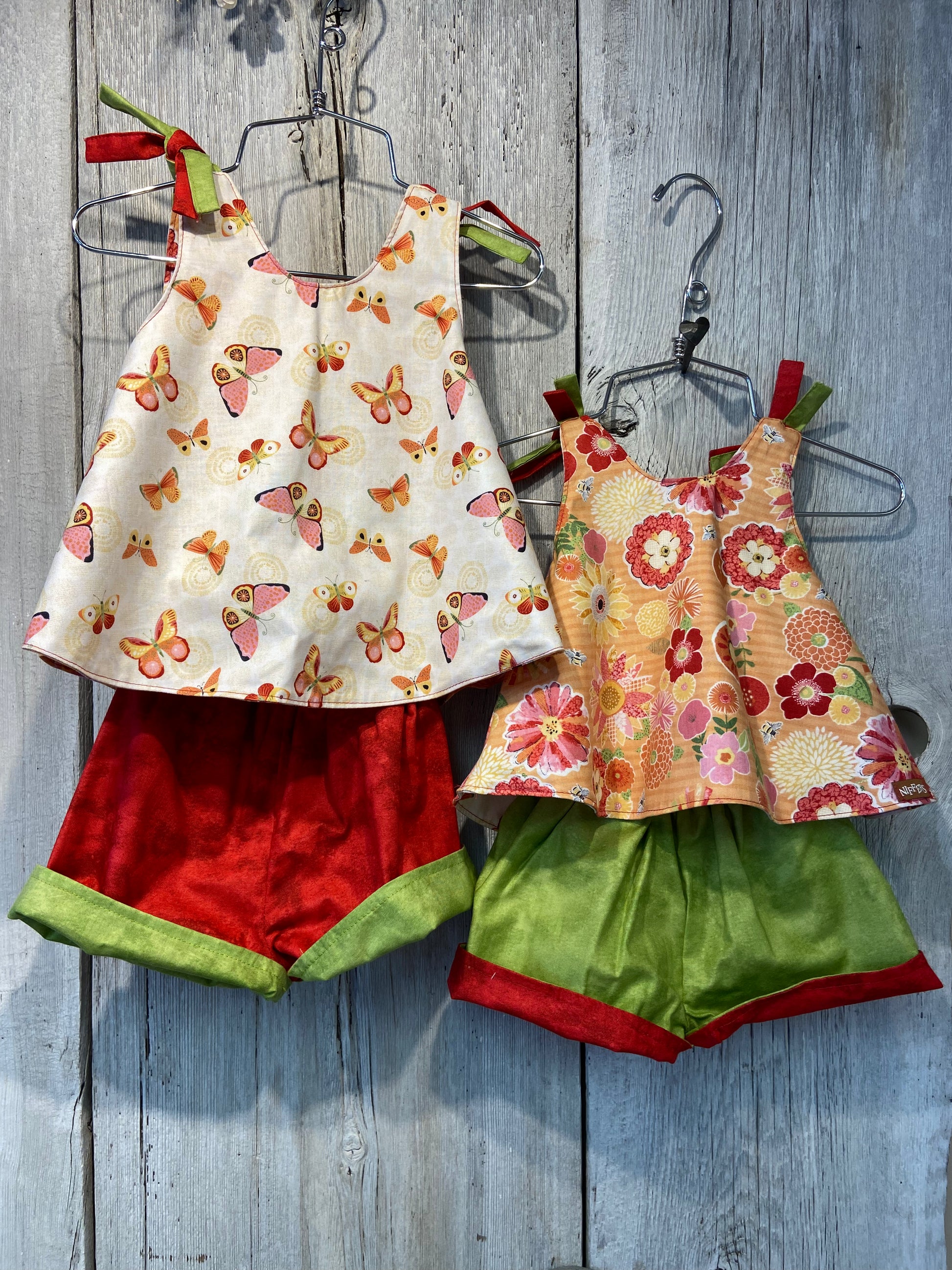 This Aline short set has classic and practical appeal. It's ability to reverse is great for those accidental spills. The top can be worn as a tunic with tights and a ti shirt for those cooler days. The ties at the shoulder allow this garment to grow with your child. This quality garment is handmade in Bancroft, Ontario and is a unique look for your summer play days.