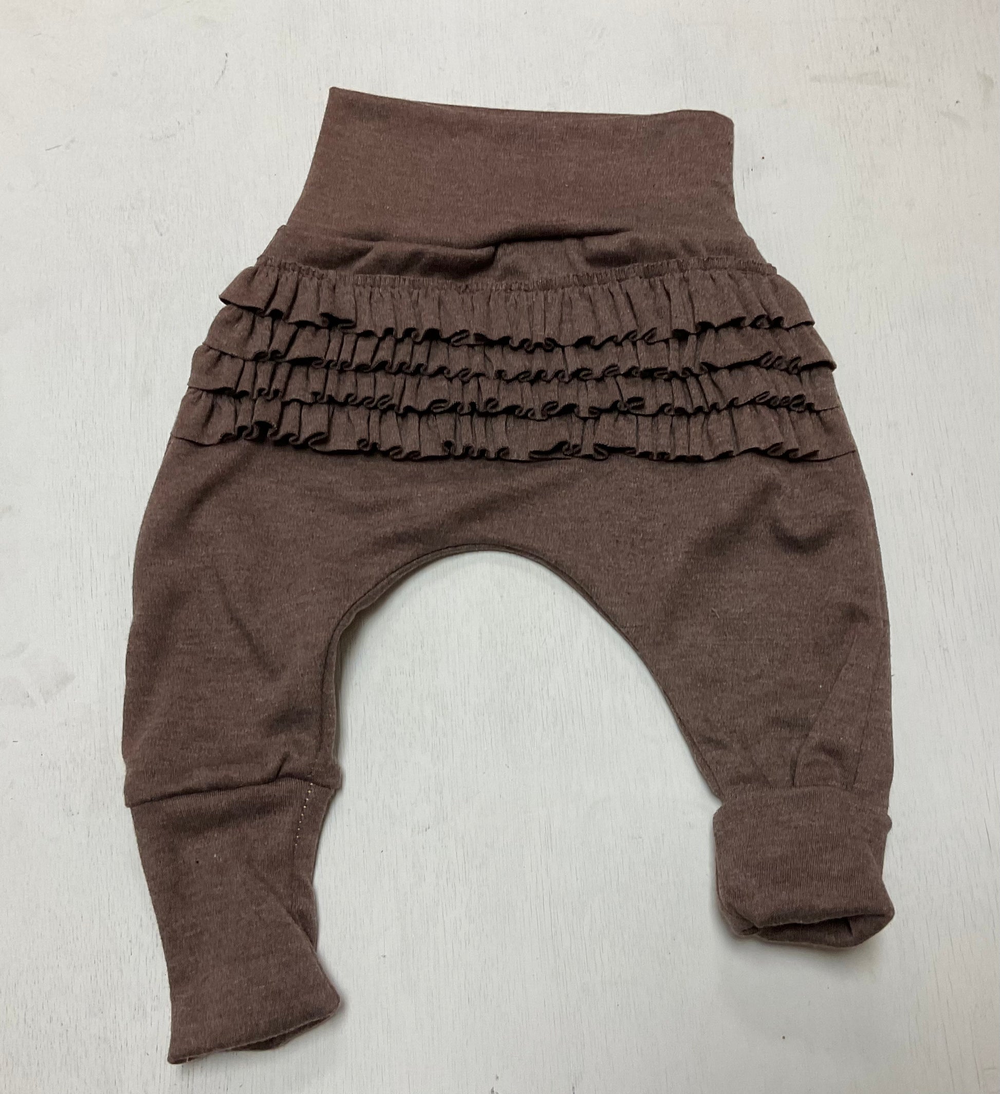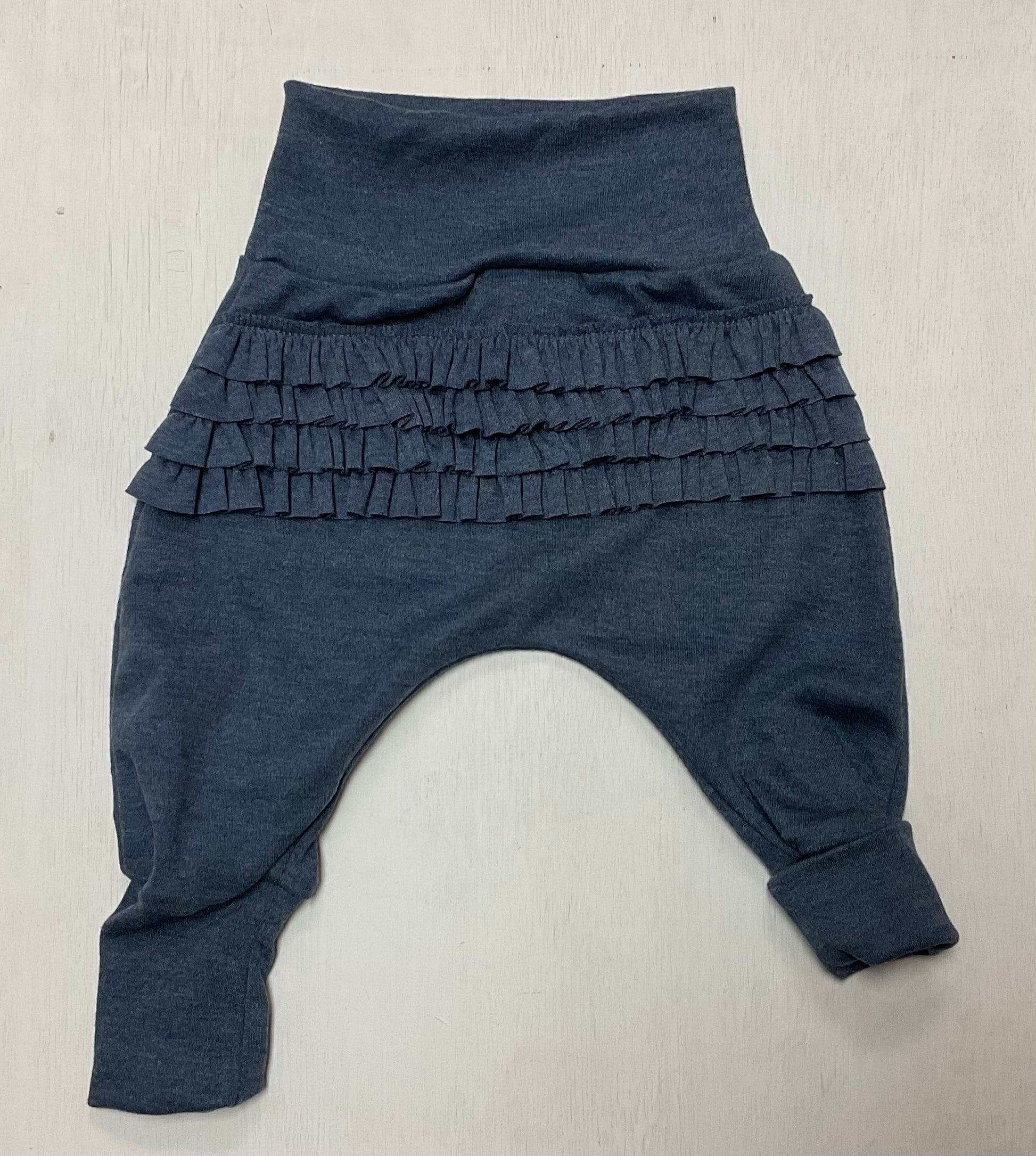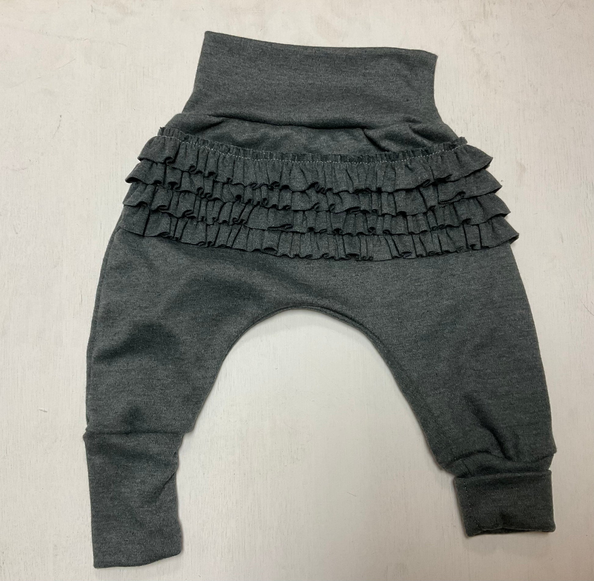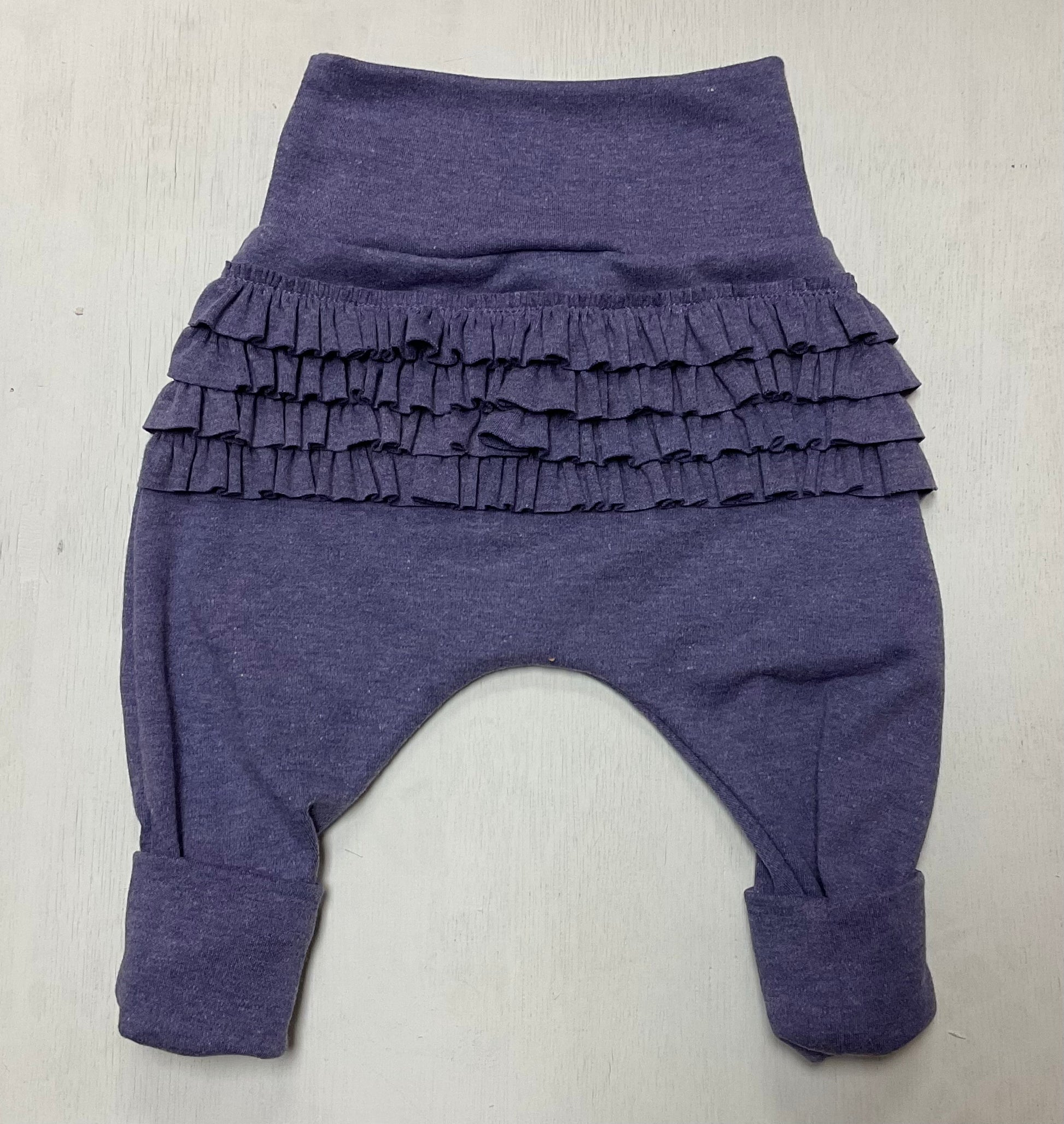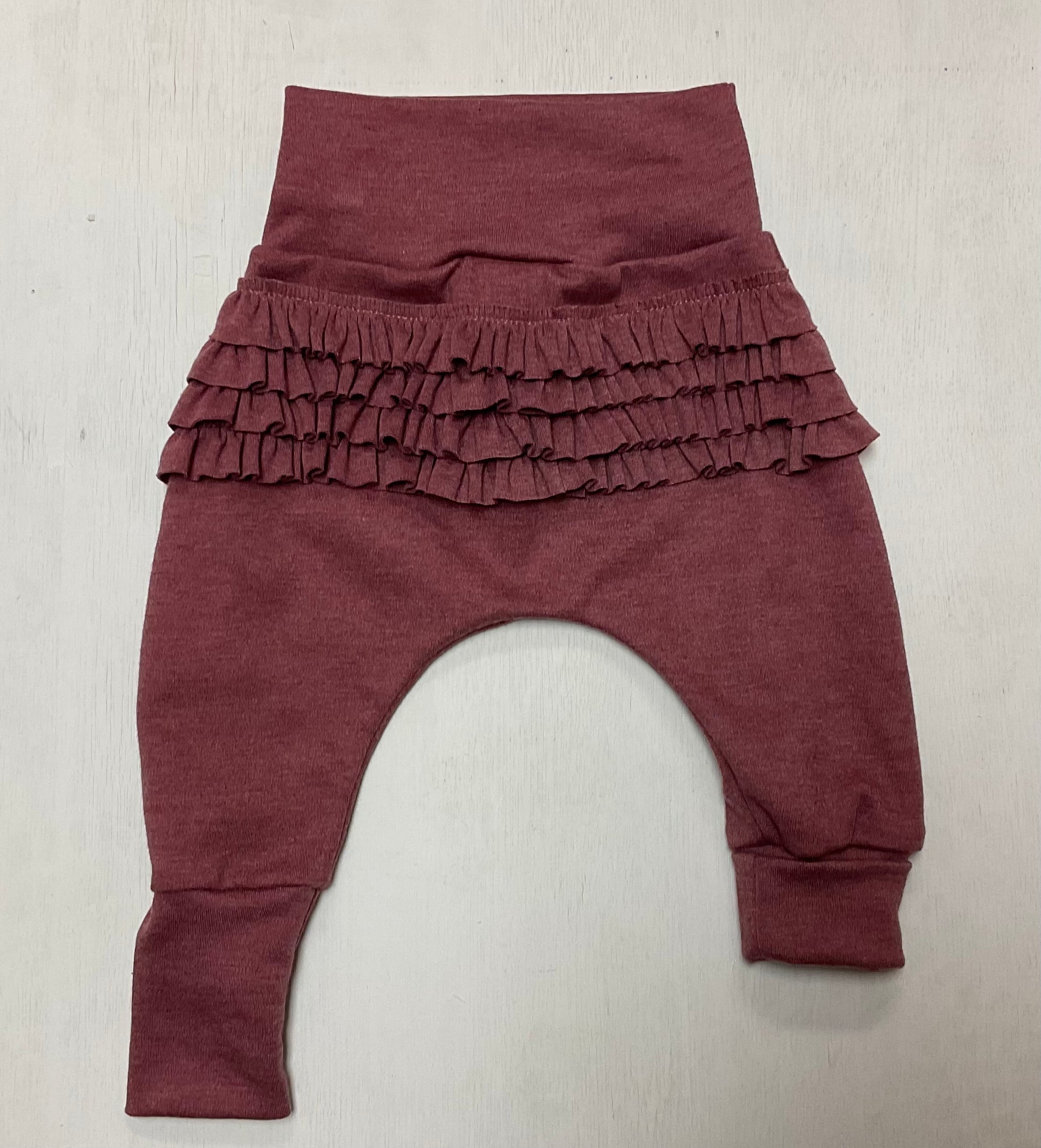 One of our most popular products for babies is our grow pants. They became so popular moms wanted them in a toddler size.These pants are handmade in Bancroft Ontario and are made from a quality blended Canadian knit that washes and wears well. The deep cuffs are carefully designed to accommodate the growth you will need for your baby. These sweet ruffle pants are casual, cozy and comfortable. Toddler size made with a gusset for extra stretch for your active kid.