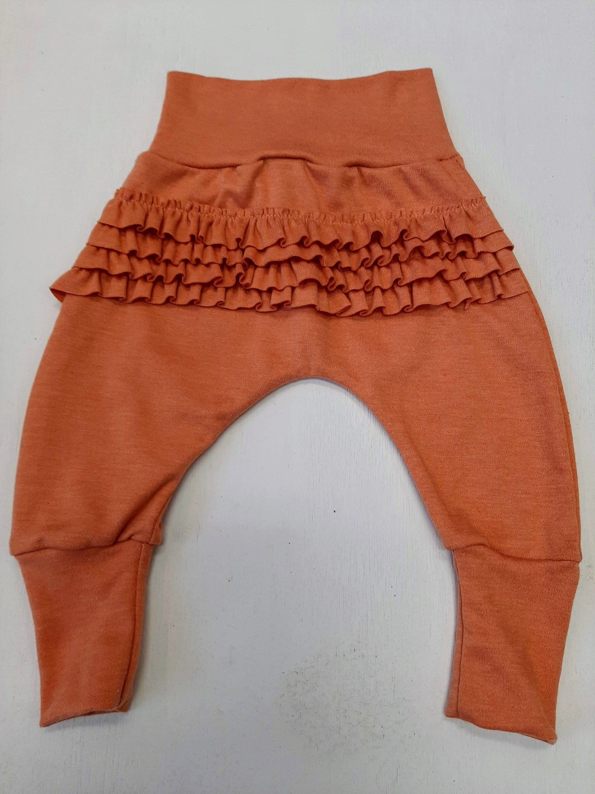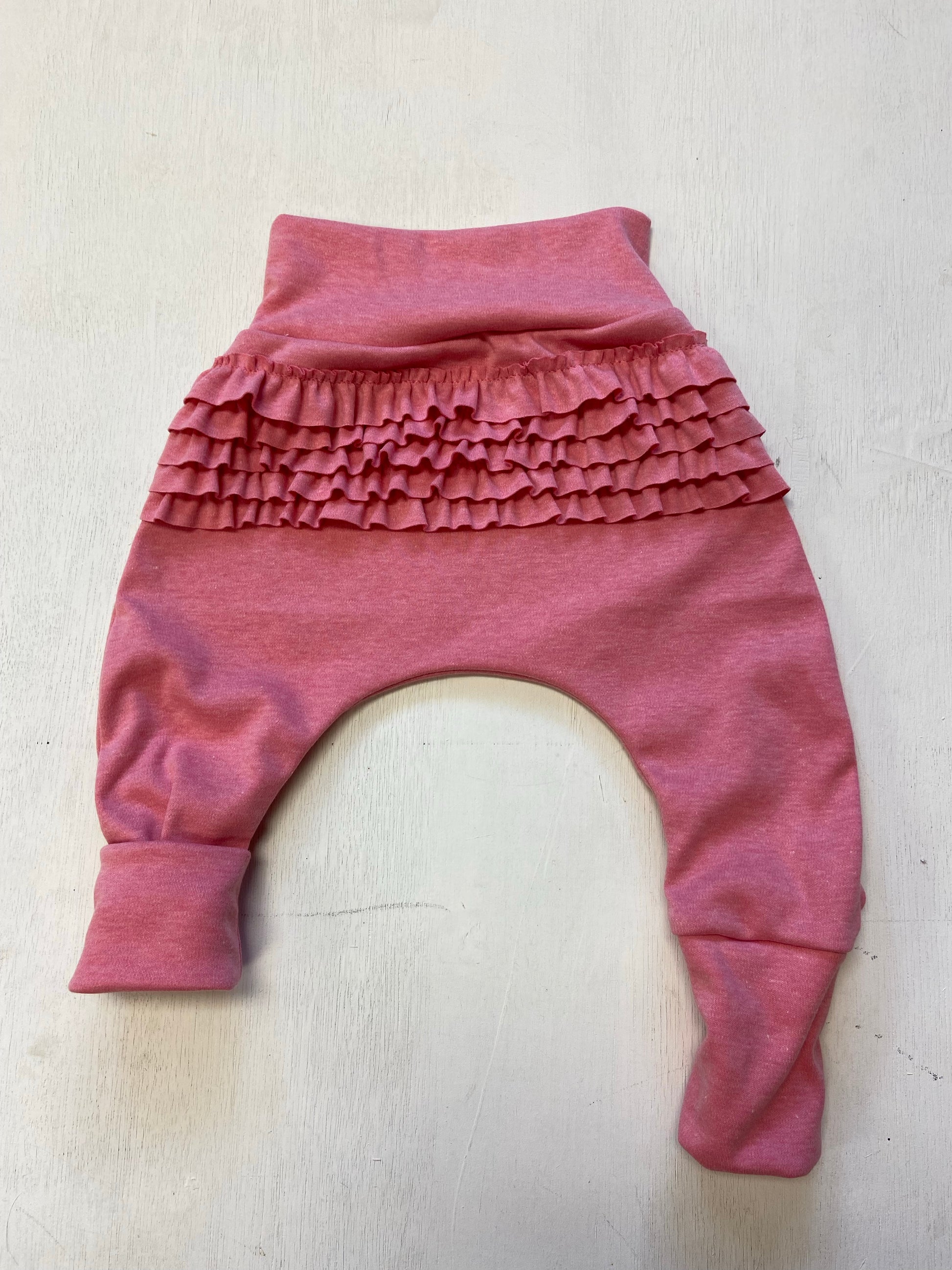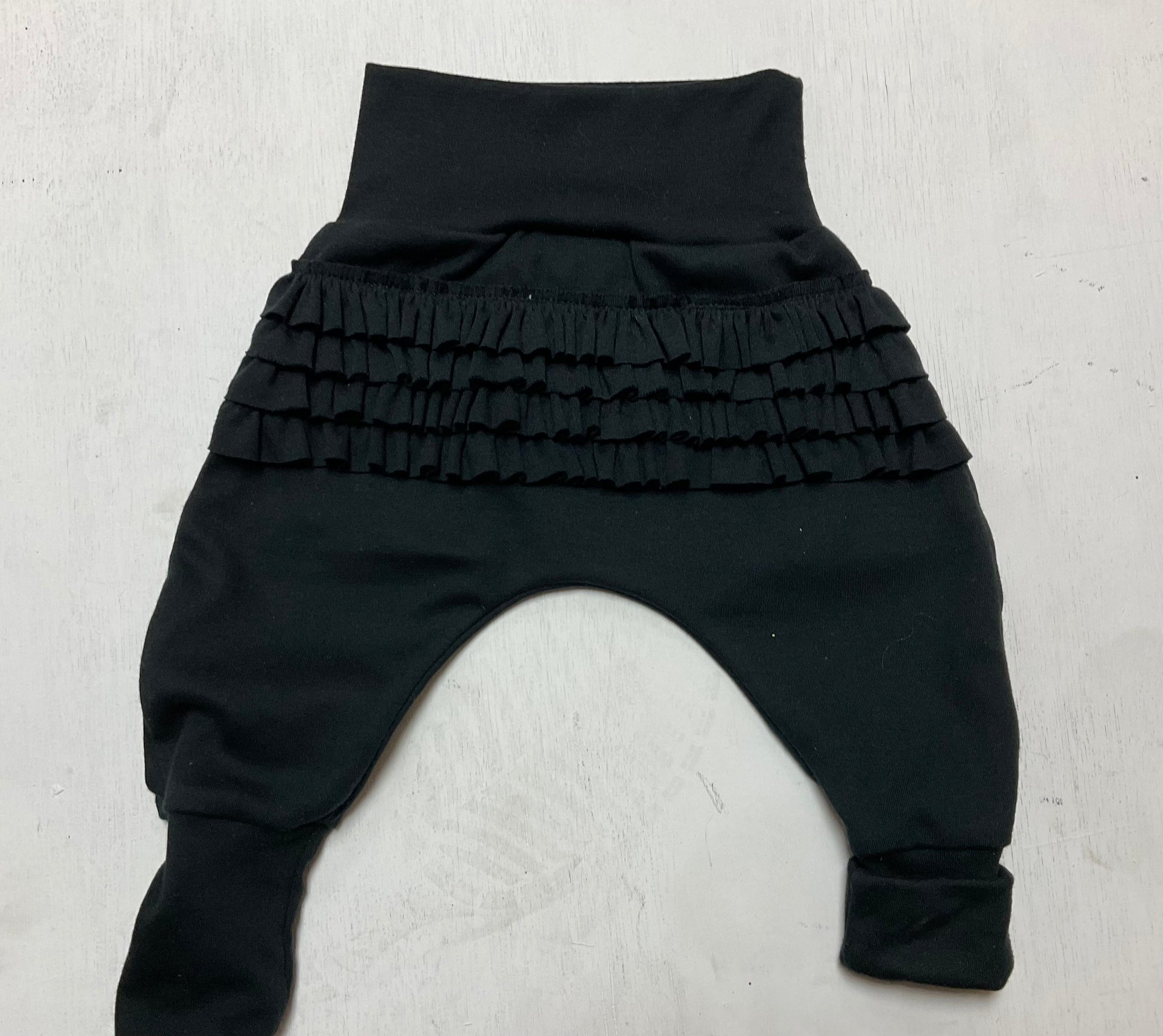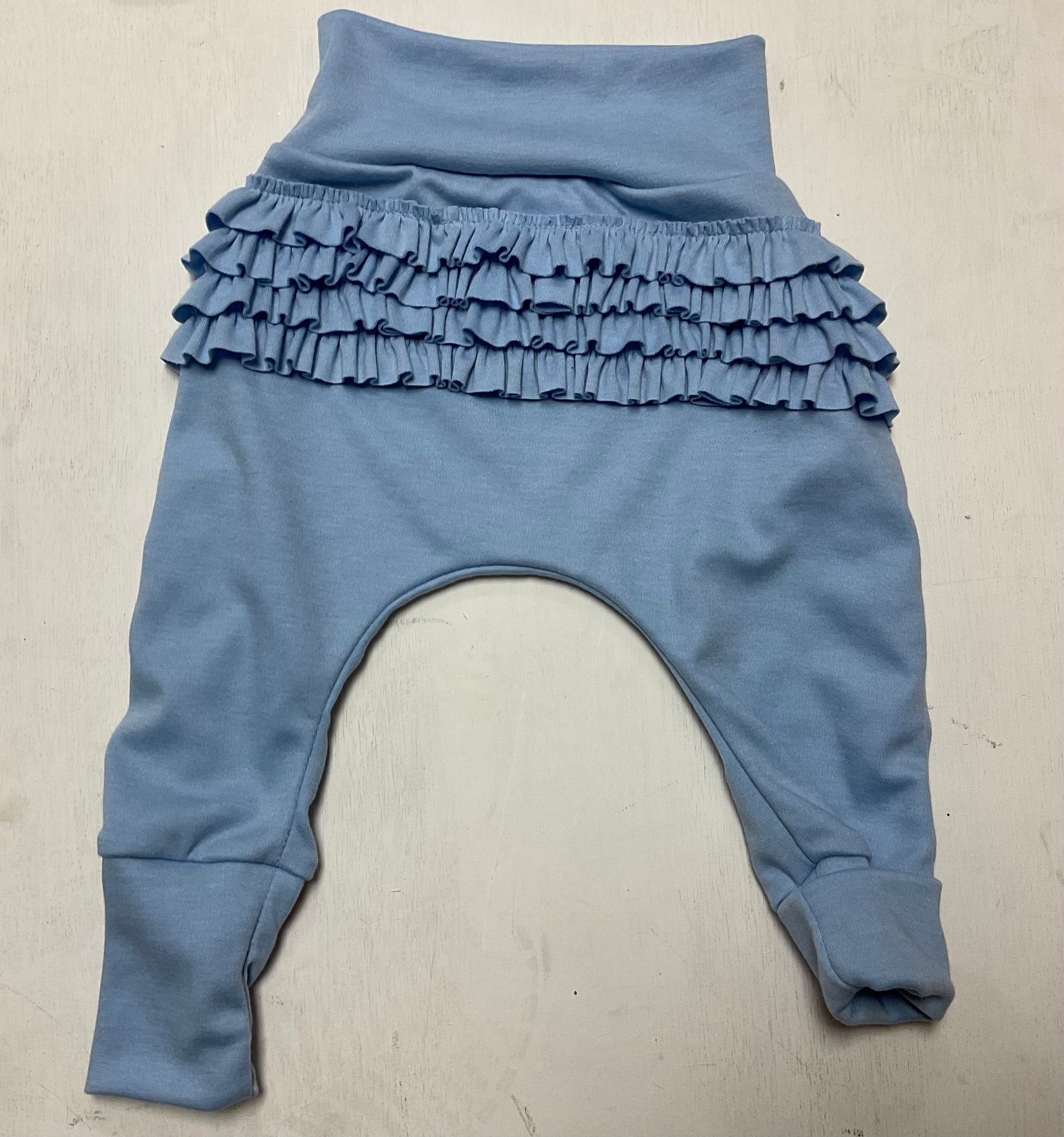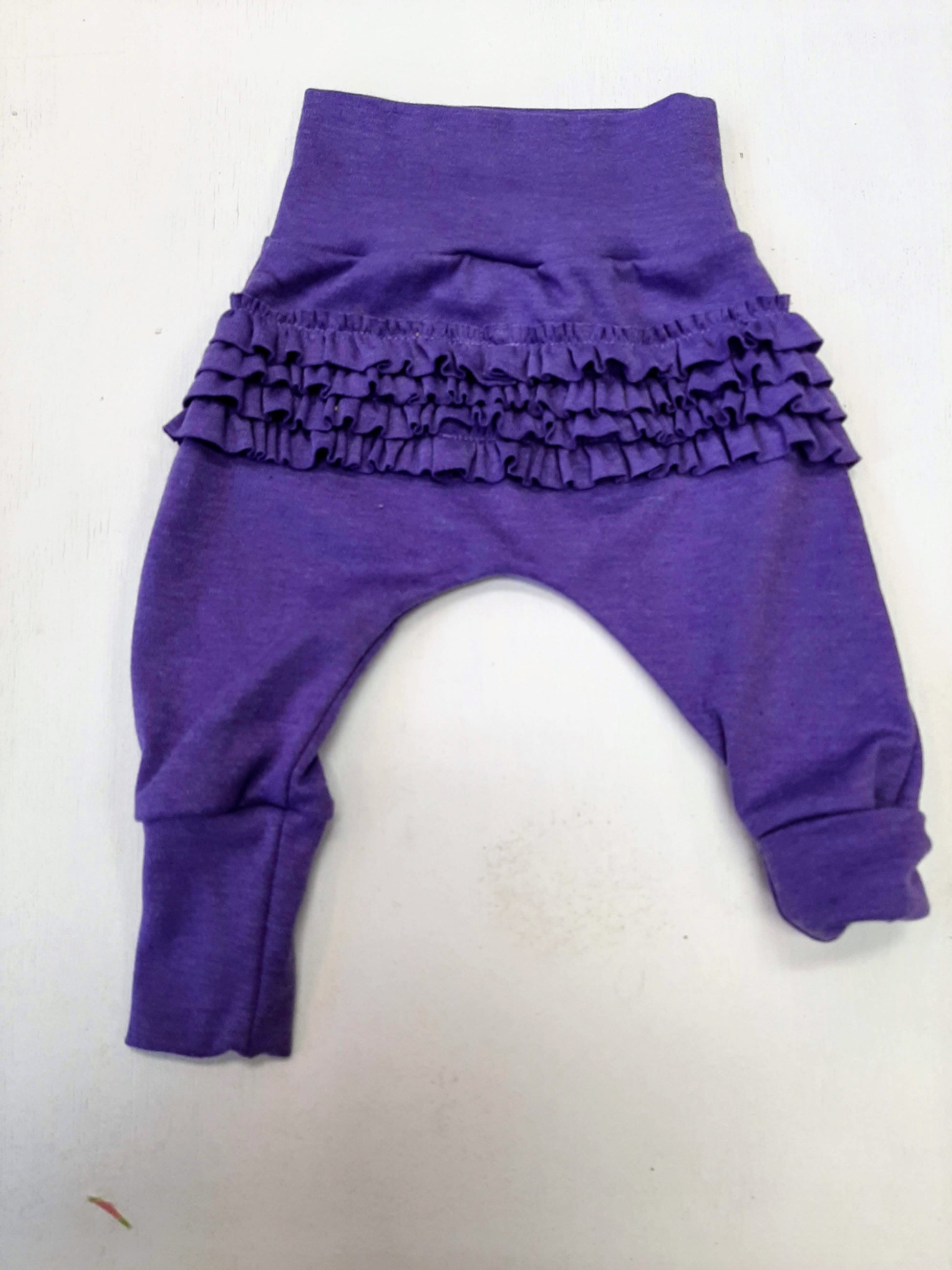 One of our most popular products for babies is our grow pants. They became so popular moms wanted them in a toddler size.These pants are handmade in Bancroft Ontario and are made from a quality blended Canadian knit that washes and wears well. The deep cuffs are carefully designed to accommodate the growth you will need for your baby. These sweet ruffle pants are casual, cozy and comfortable. Toddler size made with a gusset for extra stretch for your active kid.