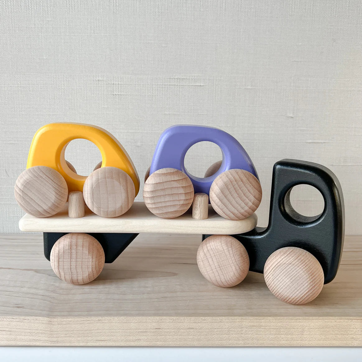 Beep beep! Coming through! This brightly colored auto transporter comes in 3 parts: a red truck, a trailer, and one blue car. Perfectly engineered for little hands and is compatible with every Bajo small car!