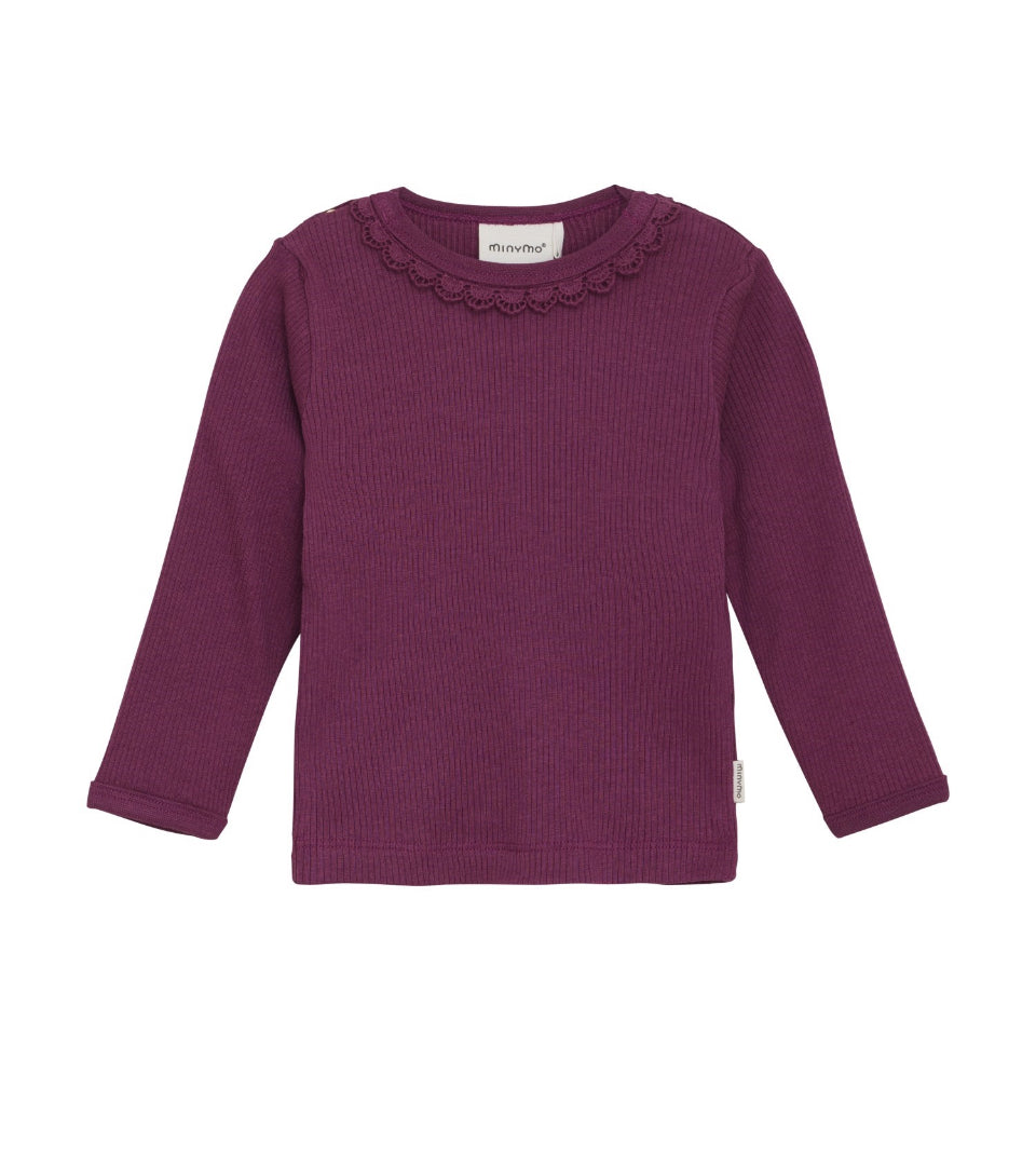 Baby Magenta Ribbed Long Sleeved Shirt with Lace Trim-MinyMo