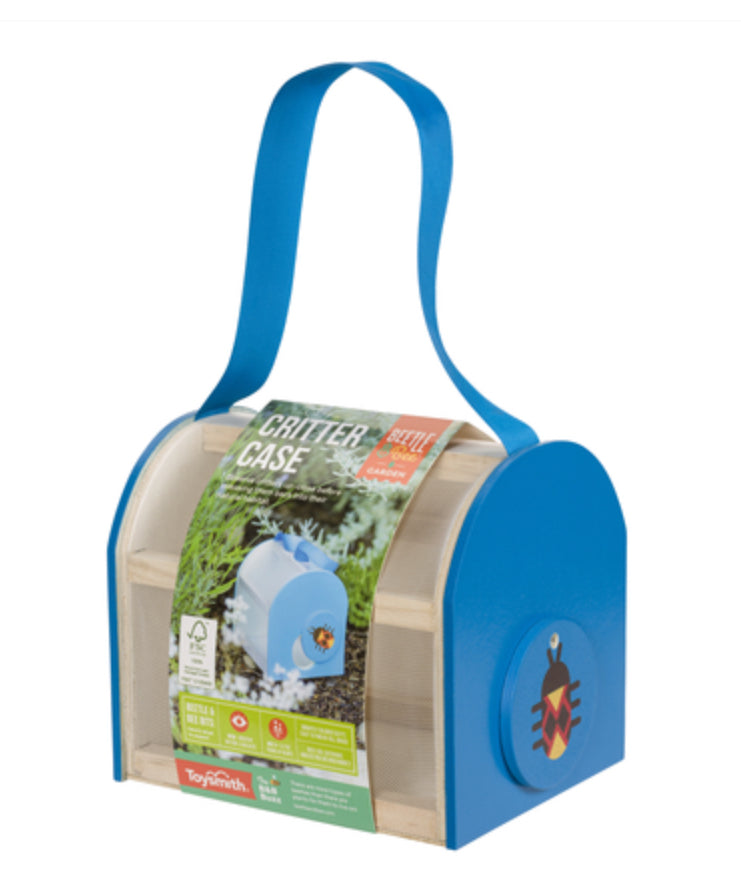 High quality wood frame with swivel door to safely capture and observe critters. 6.25” x 5” x 5.5” (without strap). 3yr+