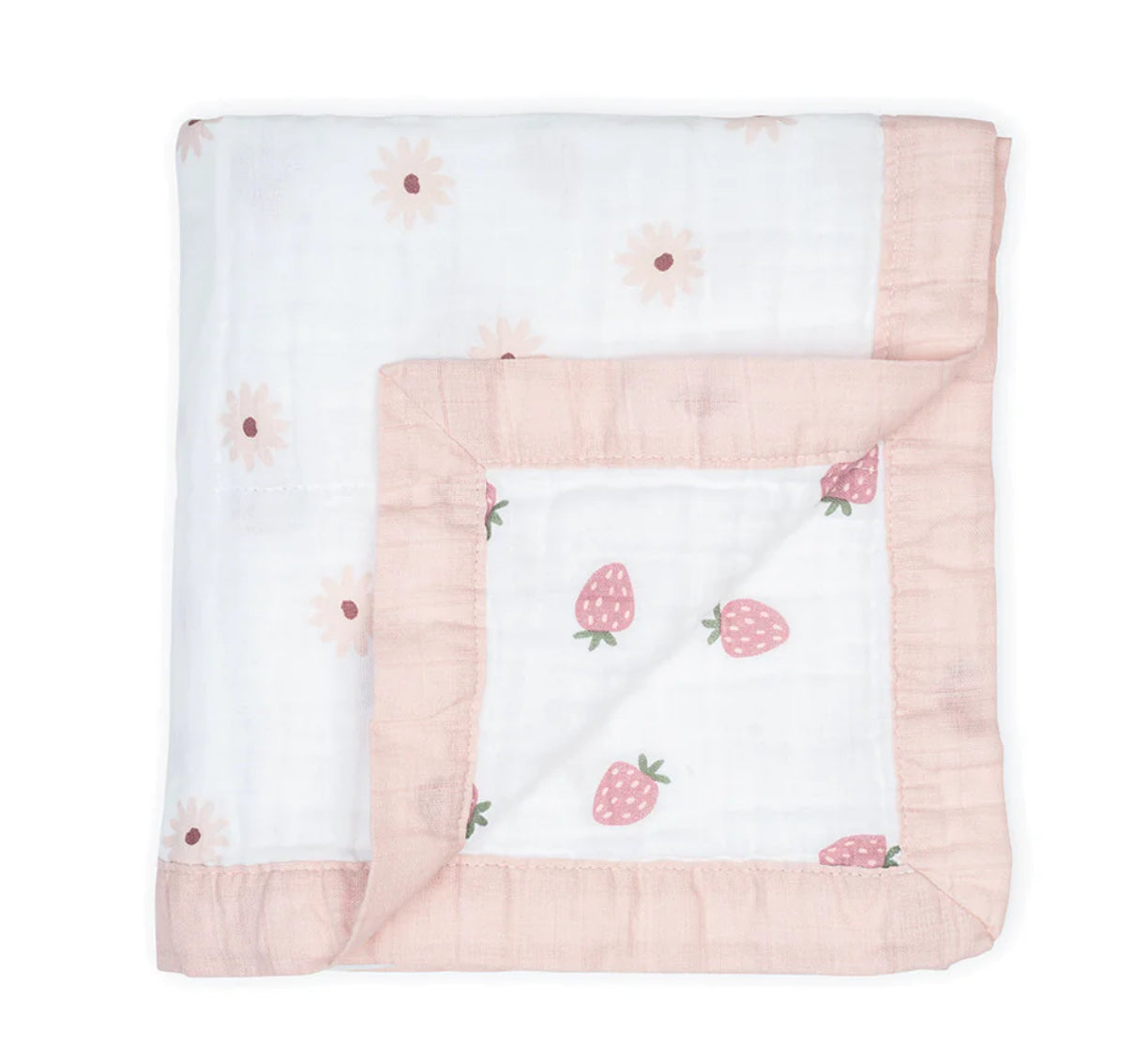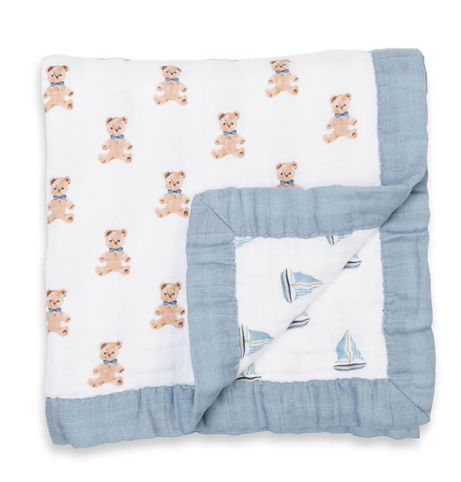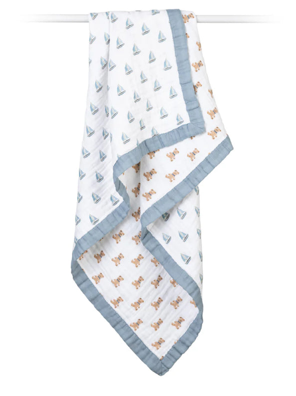 Warm and cozy for play, cuddles, and bed time. This beautifully soft quilted blanket is perfect for a little one to use throughout their childhood. Made with 4 layers of deluxe muslin with jersey trim.
