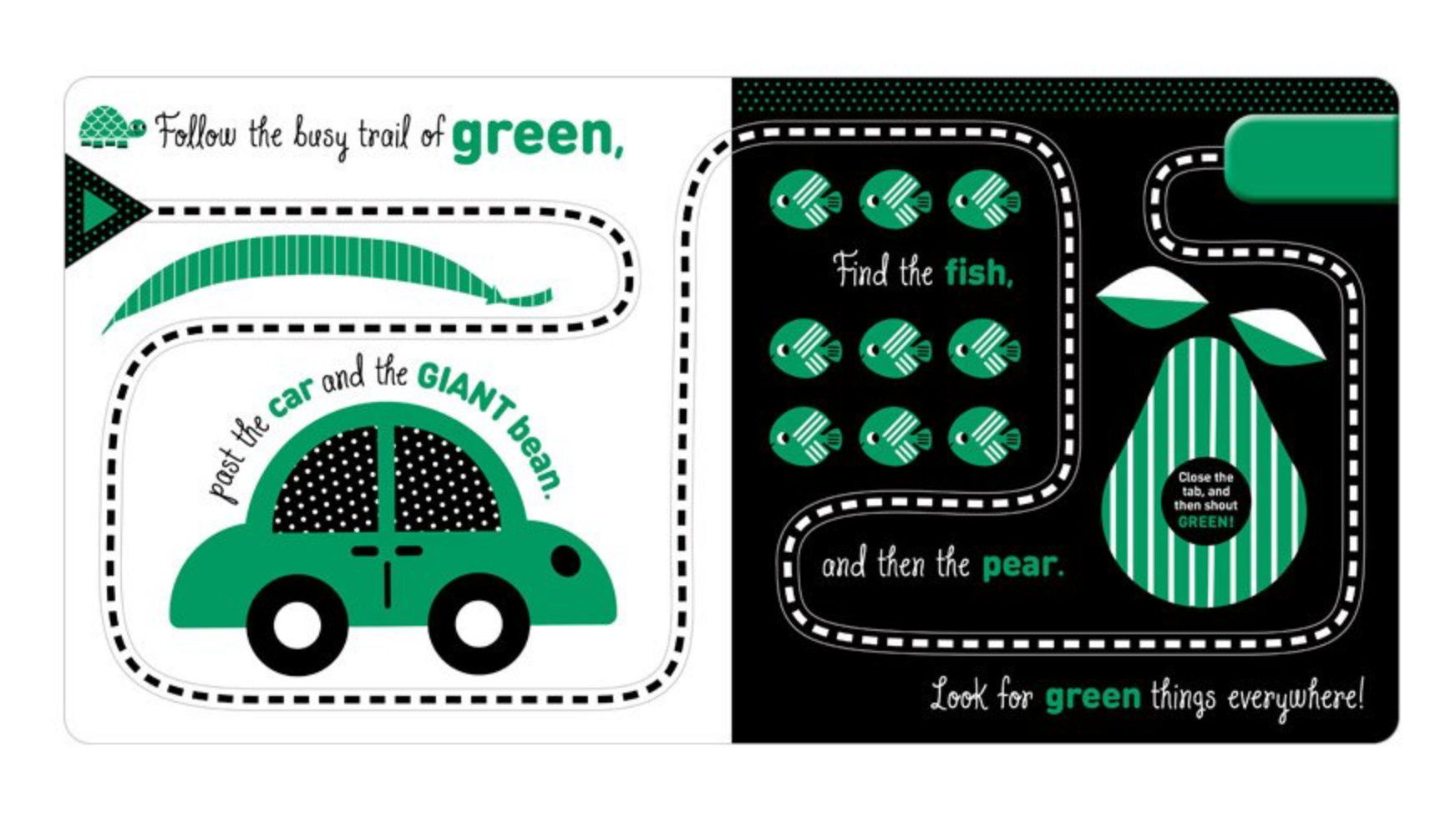 Follow the finger trails through this vibrant book about colors. Little ones will love opening the five Velcro tabs on the cover, then reattaching them to the matching colored pages inside. By Scott Barker. For newborns+.