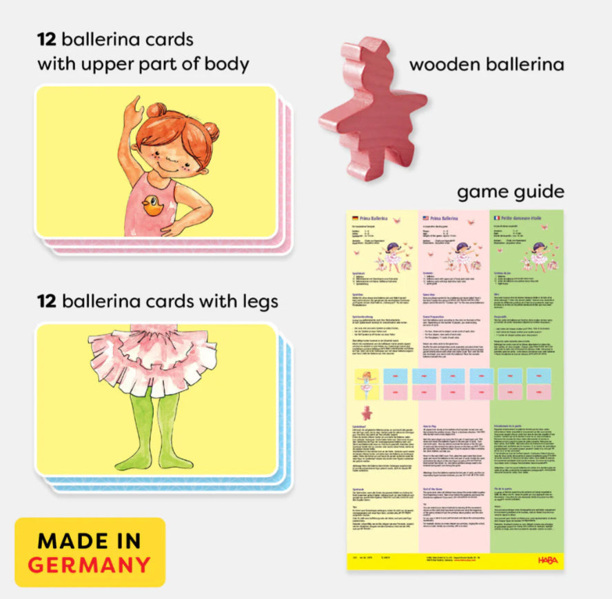 - Contents: 1 wooden ballerina, 24 movement cards, 1 game instructions.