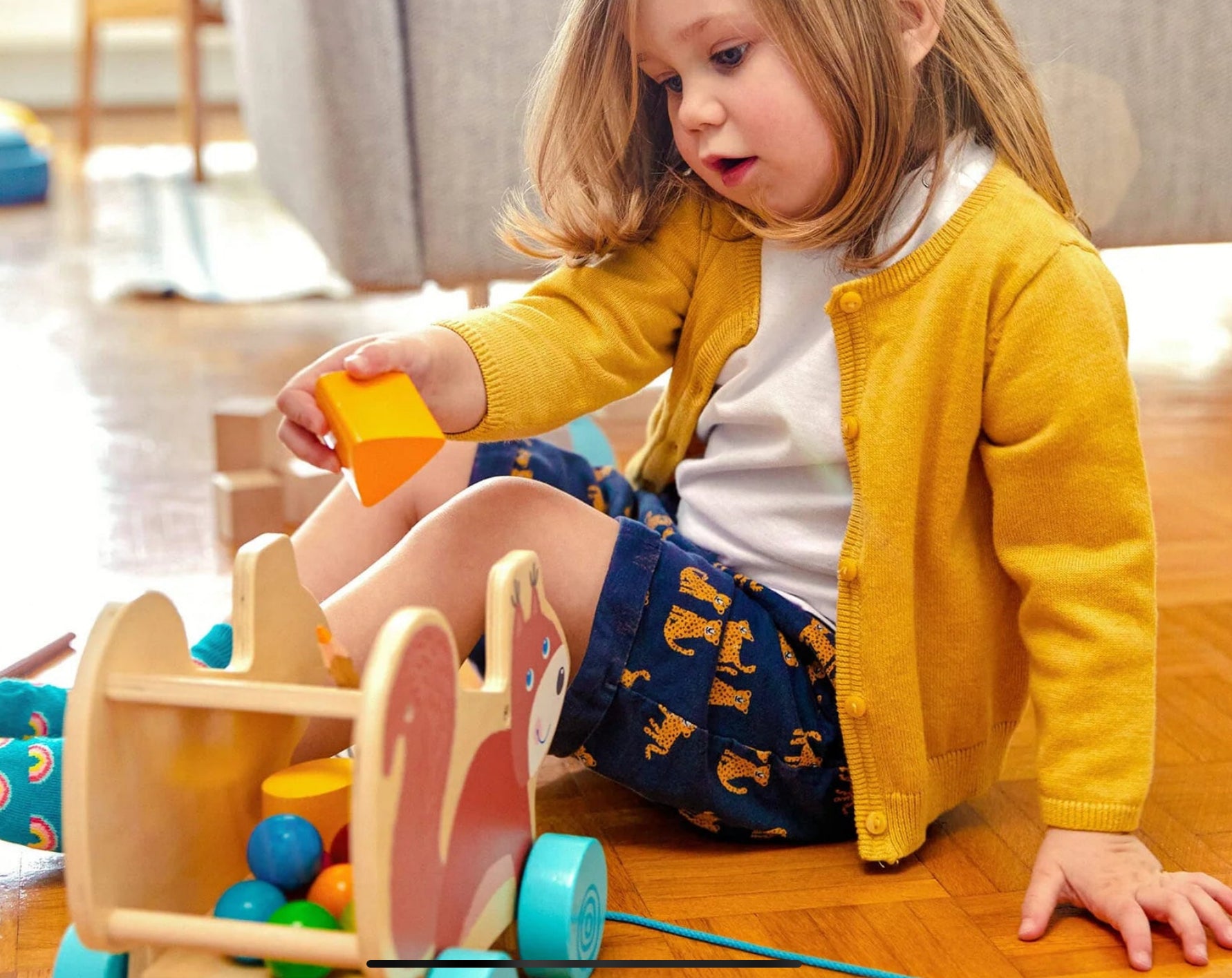 This squirrel is ready to scurry all day long to help little ones gather shapes and sort colors! This clever 2-in-1 pulling toy and sorting box will promote the development of motor skills and recognition of colors and shapes. With smooth gliding wheels, this cheerful squirrel will provide endless fun for little walkers and curious kids to explore.