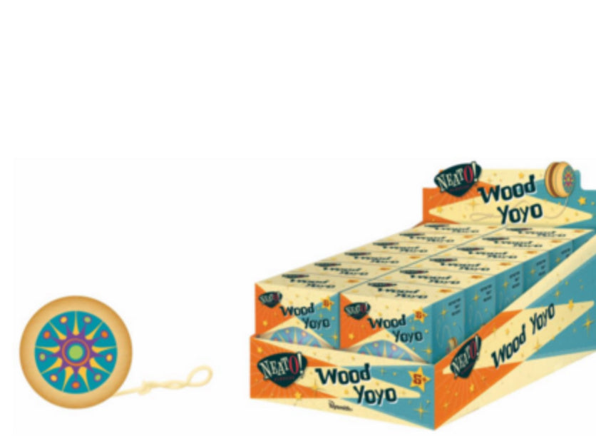 Introduce the kids to a longtime favorite toy that provides hours of entertainment. This classic wood yo-yo from Neato! is crafted from beech wood and has a 36” string. A symmetrical round design decorates the faces of each yo-yo. Comes packaged in a cardboard window box. Display box is decorated with nostalgic Neato! Classics design and displays 12 yo-yo boxes for easy merchandising.