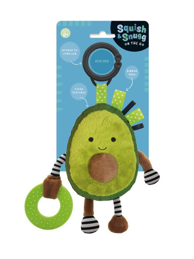 Discover the adorable On the Go plush Avocado! With a handy clip to attach to strollers and car seats, this perfectly portable plush comes complete with a rattle, surprise crinkles, and mixed textures to keep busy hands entertained, along with a teething ring to sooth sore gums.
