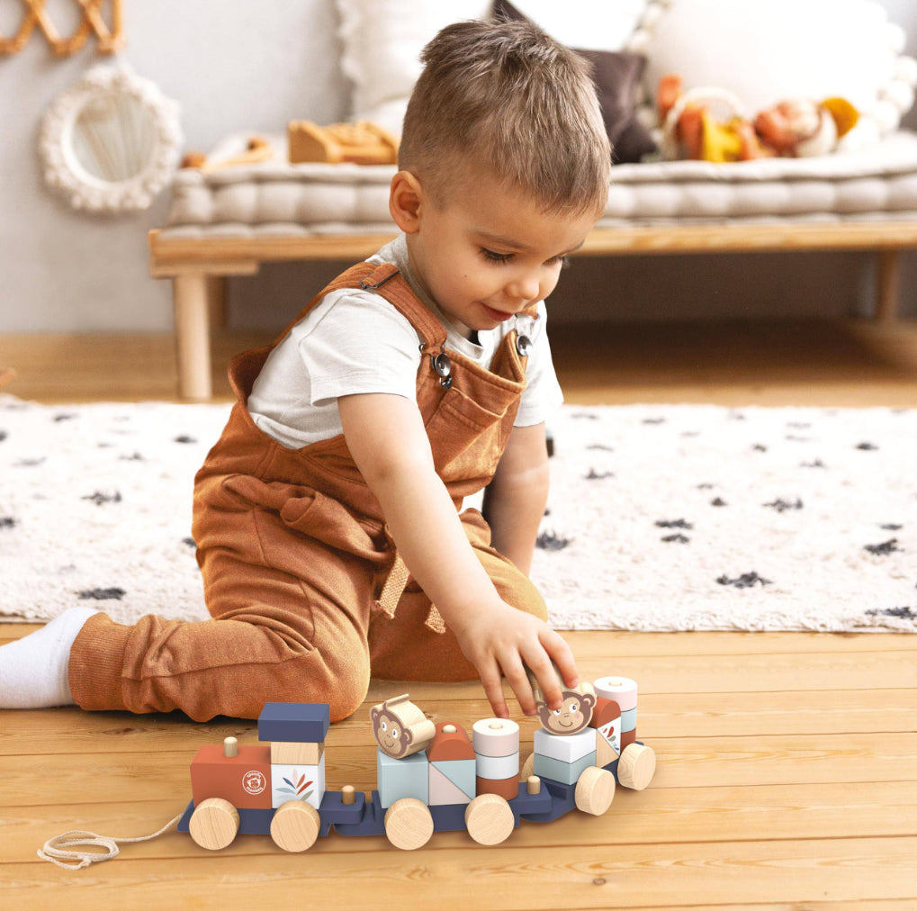 A fun wooden pull-along train stacker, painted in trending soft colours and featuring Speedy Monkey's favourite character, the monkey.