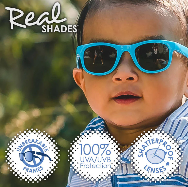 Bend 'em, flex 'em, you can't break 'em! Your little one will be the coolest looking baby on the block with our retro 80s style sunglasses. Protect young eyes from the damaging UV rays with stylish sunnies they'll love. The Real Shades Surf Unbreakable Iconic Sunglasses have a flexible fit for comfortable and durable wearing no matter where life takes you!