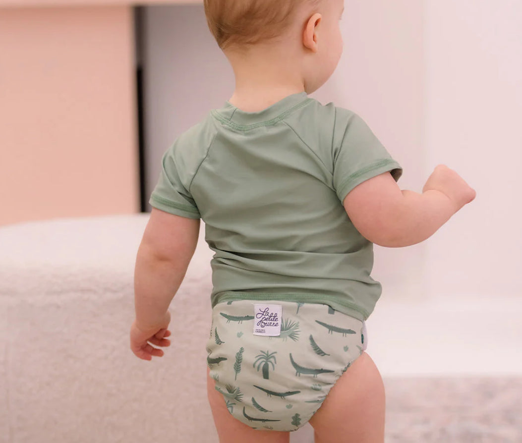 Our swim diaper will grow with your baby. Along with its waterproof exterior, it has 3 layers of bamboo to help absorb small messes.
